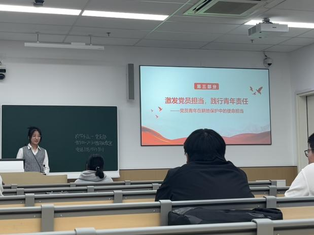 第三部分由农学242班的郎一诺同学主讲。该部分主讲人聚焦党员青年的责任担当,分享了bwin必赢3003专家参与国家耕地保护立法、全国土壤普查与耕保培训的实例,以及陕西延安“田长守护网络”机制、安徽全椒县“党支部+网格党小组+党员中心户”三级管控体系等基层创新实践,凸显党员在耕地数量守护与质量提升中的先锋作用。